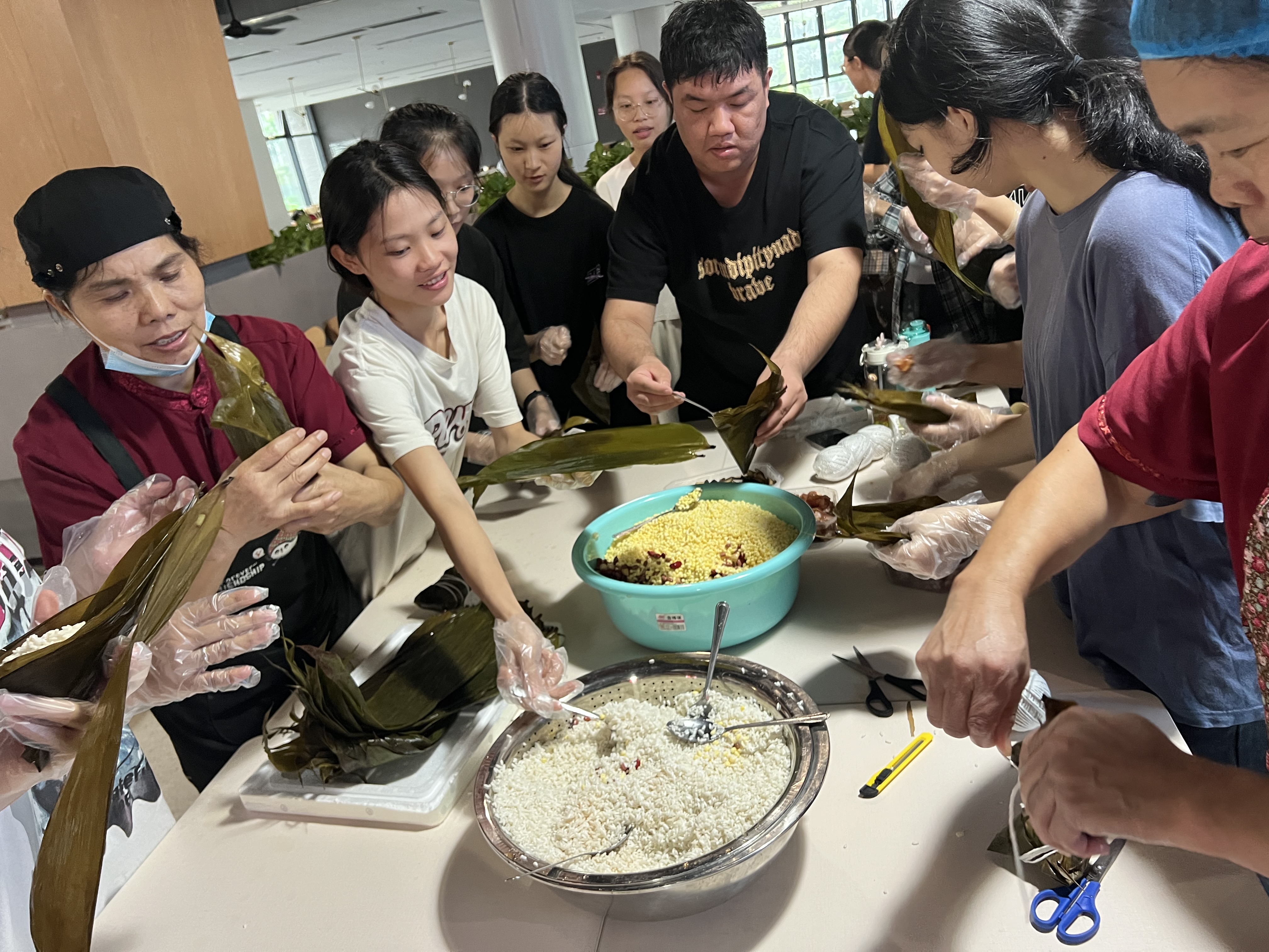 活动现场,老师们准备好了粽叶、糯米、棉线以及包粽子所需的各种辅料。师生们围在一起,认真观摩饭堂师傅的示范后,纷纷拿起粽叶,按着刚学到的方法,有步骤地包了起来。填糯米、压紧实、封口、捆扎,不一会儿功夫,一只只漂亮的粽子瞬间成型,欢笑伴着粽香久久飘荡在大家周围。