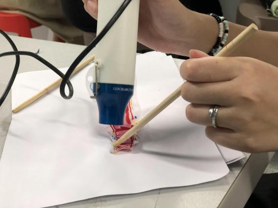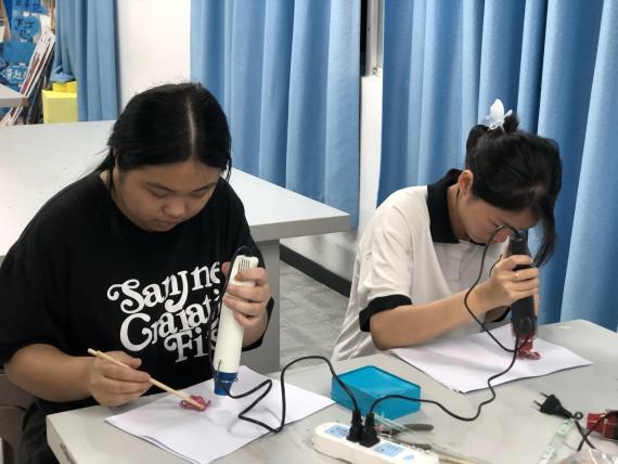 在使用热风枪时,热风枪的加热使其瞬间缩小变形,初次感受的同学们,让热缩片卷曲的过程令人担忧,但最终也是有惊无险,获得一个平整的精美作品。卷曲的过程就像是我们在生活中遇到的种种困难,只要我们经受住考验,不断调整,摆平心态,最终都会涅槃重生。