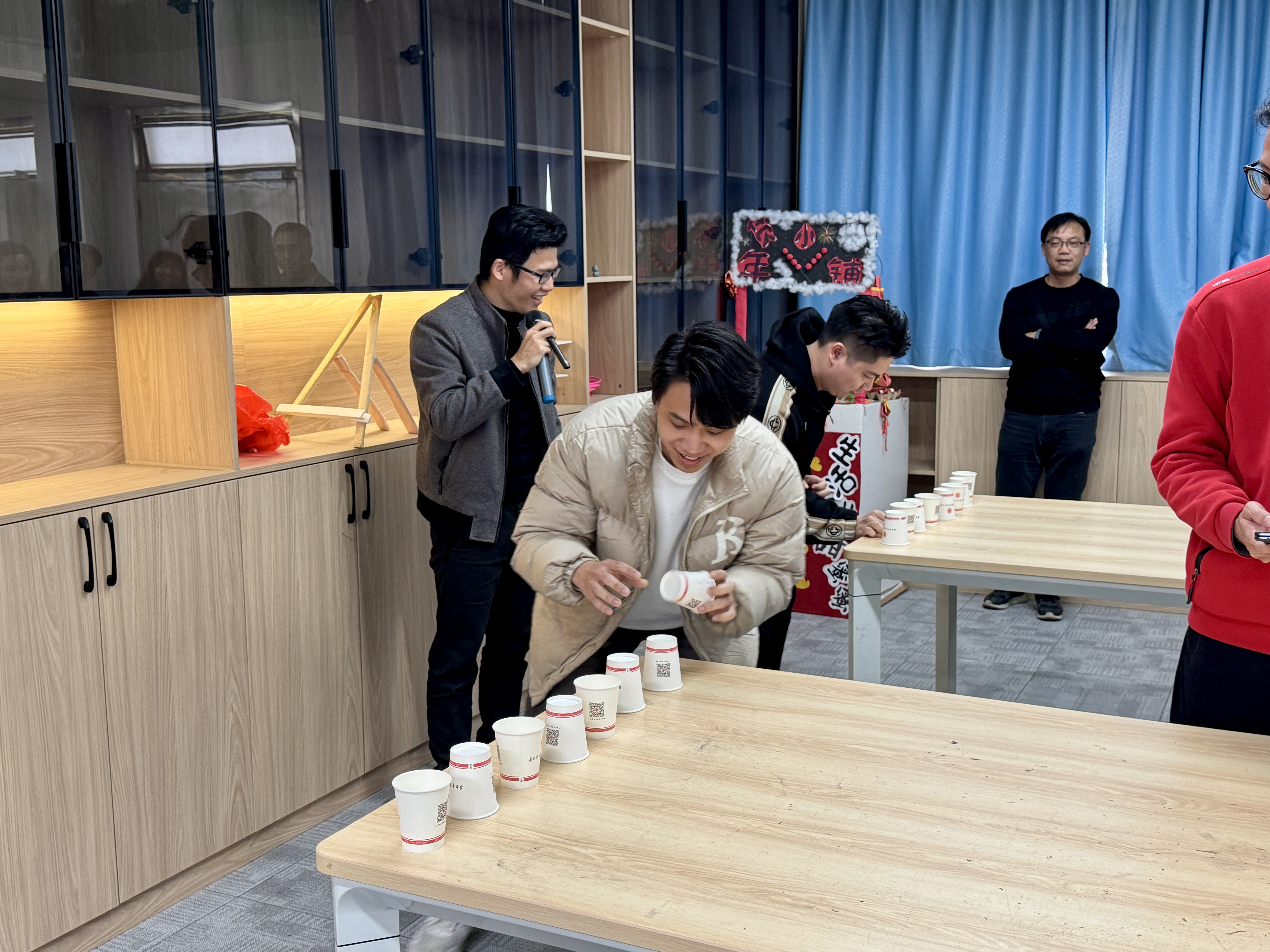 在“鲤鱼大翻身”游戏中,每个组员依次将纸杯翻过,用时最少的组获胜,整个比赛充满欢声笑语。