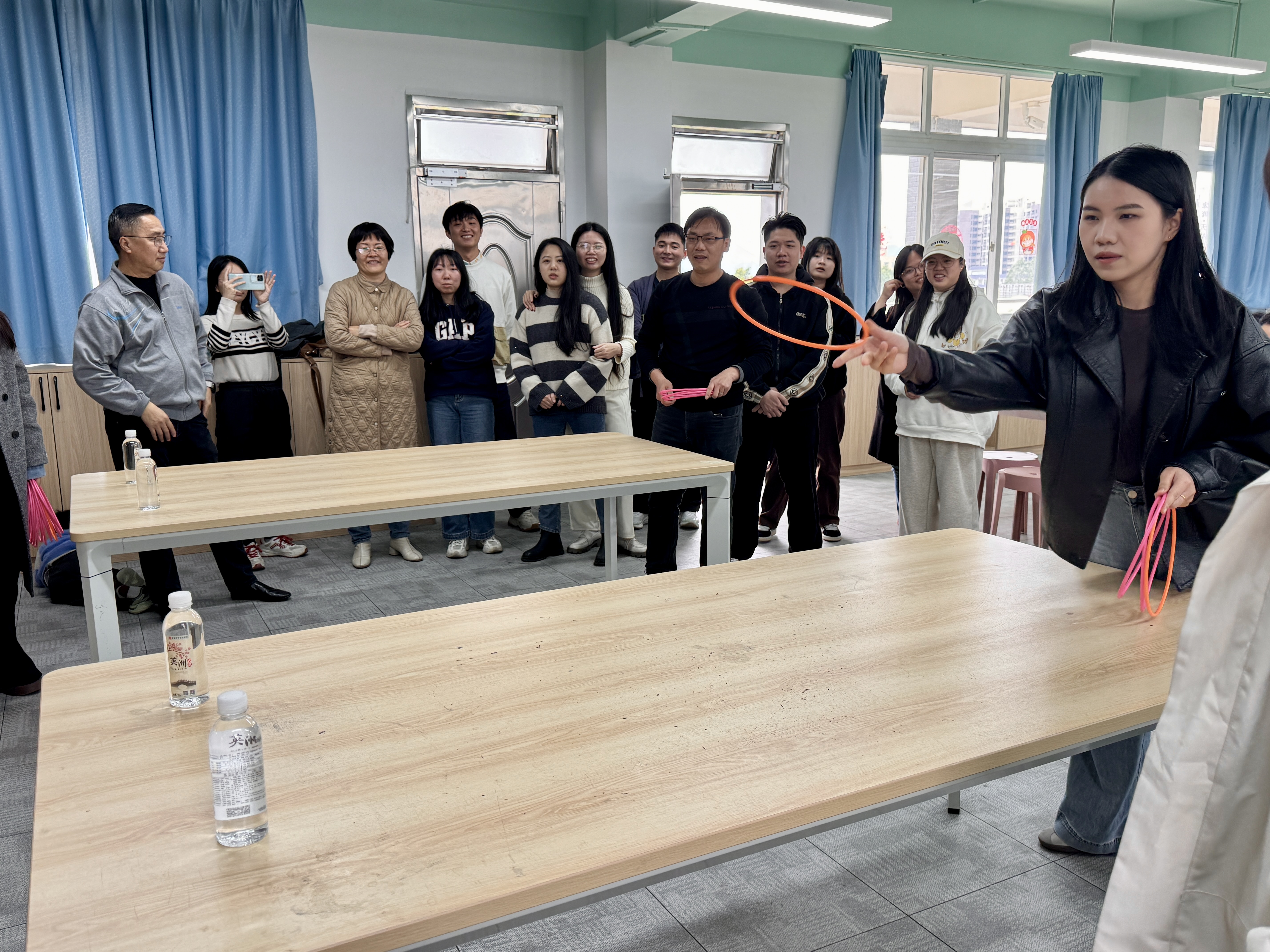 在第二个环节,会上组织老师们开展了和谐欢乐的系部团建活动,包括三项趣味横生的游戏:“幸运趣套圈”、“鲤鱼大翻身”和“纸运乒乓球”。团建活动增强了全体教职工的向心感和凝聚力,提升教师们的职业归属感和幸福感。