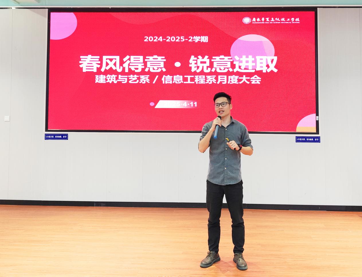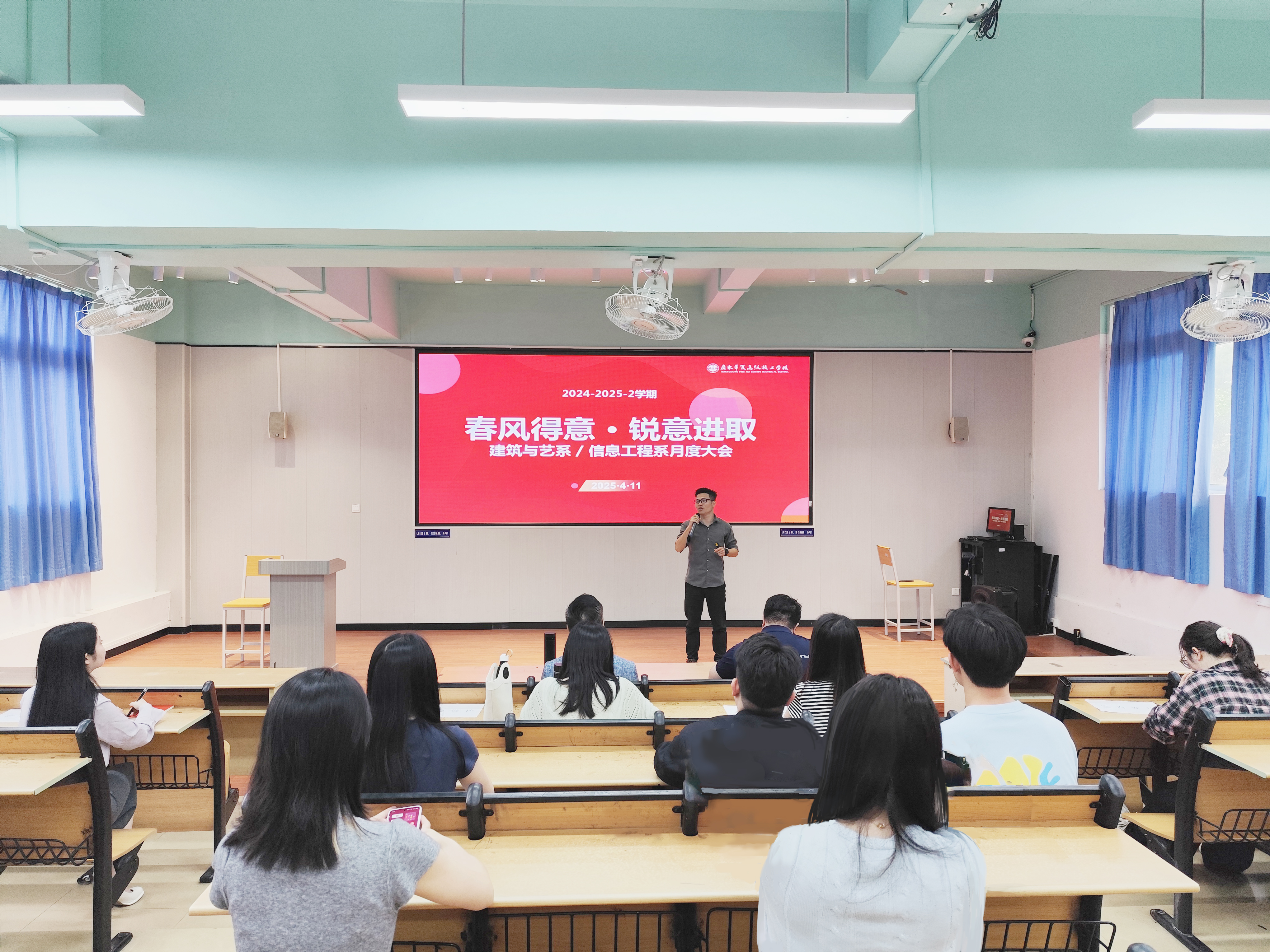 2025年4月11日,建筑与艺术系/信息工程系在学术报告厅隆重召开月度大会,以“春风得意·锐意进取”为主题,全面总结三月工作成果,科学规划四月工作方向,进一步凝聚全系师生力量,推动系部高质量发展。系主任曹云福,副主任郑仕焯、梁华君、教研室主任及全体教职工出席会议。