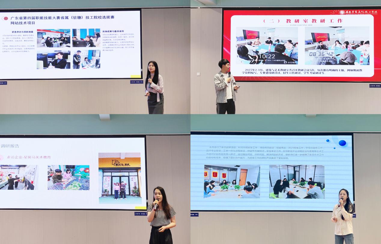 各教研室主任依次汇报三月工作成果及四月计划。汇报内容涵盖竞赛工作推进、企业调研成果、专业建设优化、教研室工作会议成效及示范校重点专业建设等方面。各主任纷纷表示,将继续以创新驱动发展,以竞赛促进教学,为系部发展注入新动力。