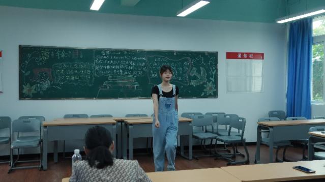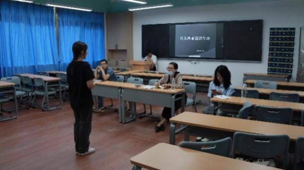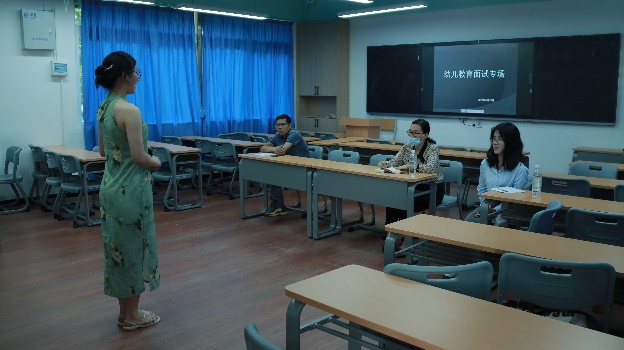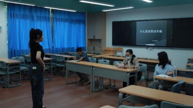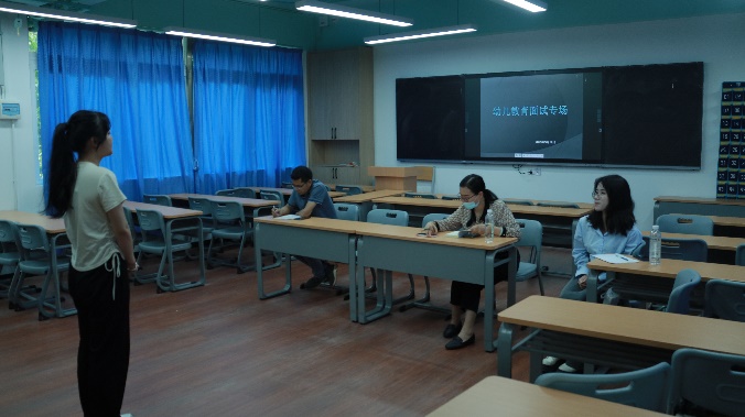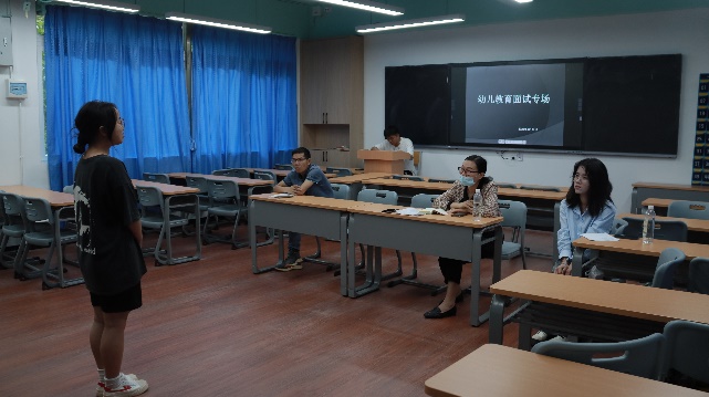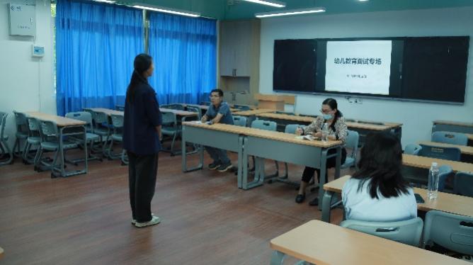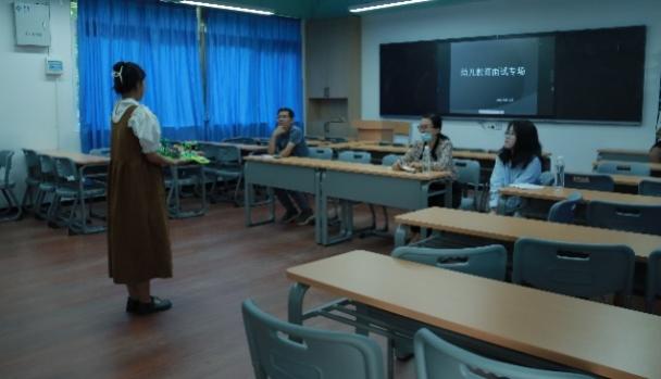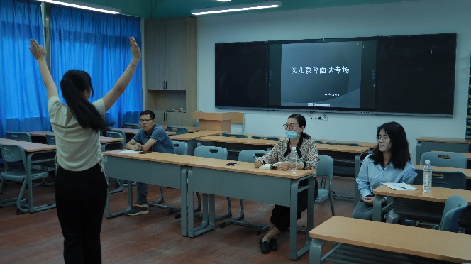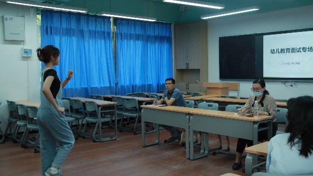 宣讲结束后,组织学生进行现场面试,学生踊跃参与,面试现场主要展示学生的专业技能:舞蹈、讲故事,展示环创作品,最后进行面试答辩。