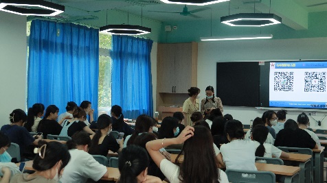 在宣讲会的互动环节,林萍园长与幼儿教师学生进行问答互动,林园长耐心为学生解答幼儿园薪资待遇、招聘人数、食宿环境等问题,林园长提供个人微信,方便现场没带纸质简历的同学,可以投递电子简历。