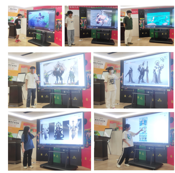 本次训练营的实训项目主要分为影视特效项目组、3D动画项目组、AI原画项目组和次时代建模项目组。19级动漫设计与制作专业的同学们以项目为分组,依次向各位校领导老师展示了自己的学习成果,并发表了此次学习的感想。