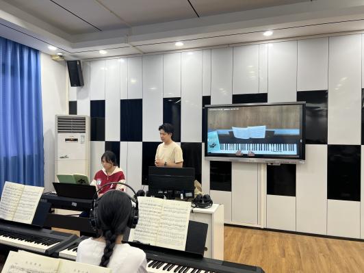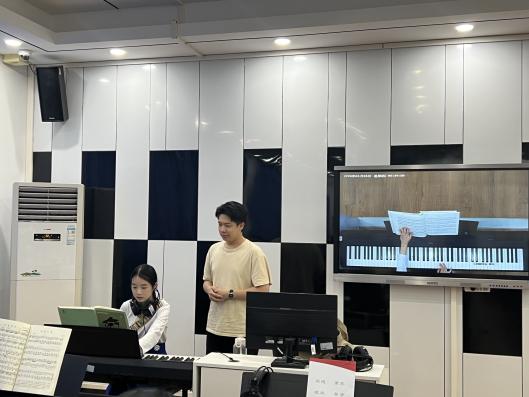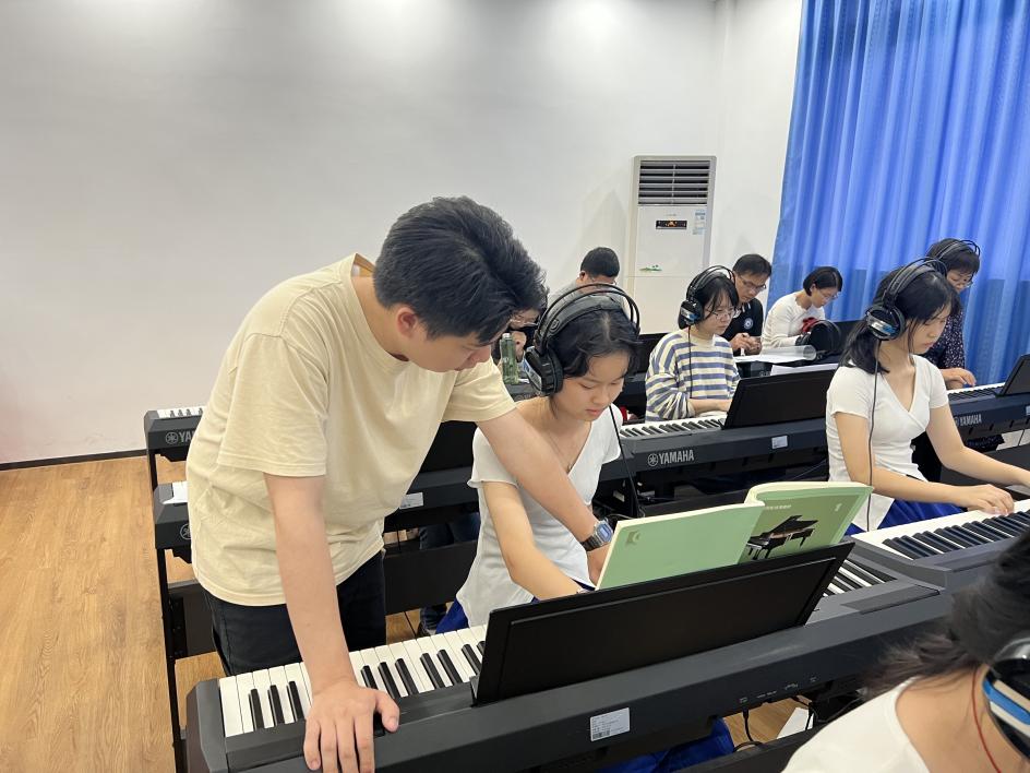 在示范教学后,李展鸿老师鼓励学生们独立尝试弹奏《风笛舞曲》,充分调动了学生的积极性和参与度,学生练习过程中,李老师巡堂单独指导,及时纠正学生存在的问题,让学生更好、更快得掌握与理解重难点。