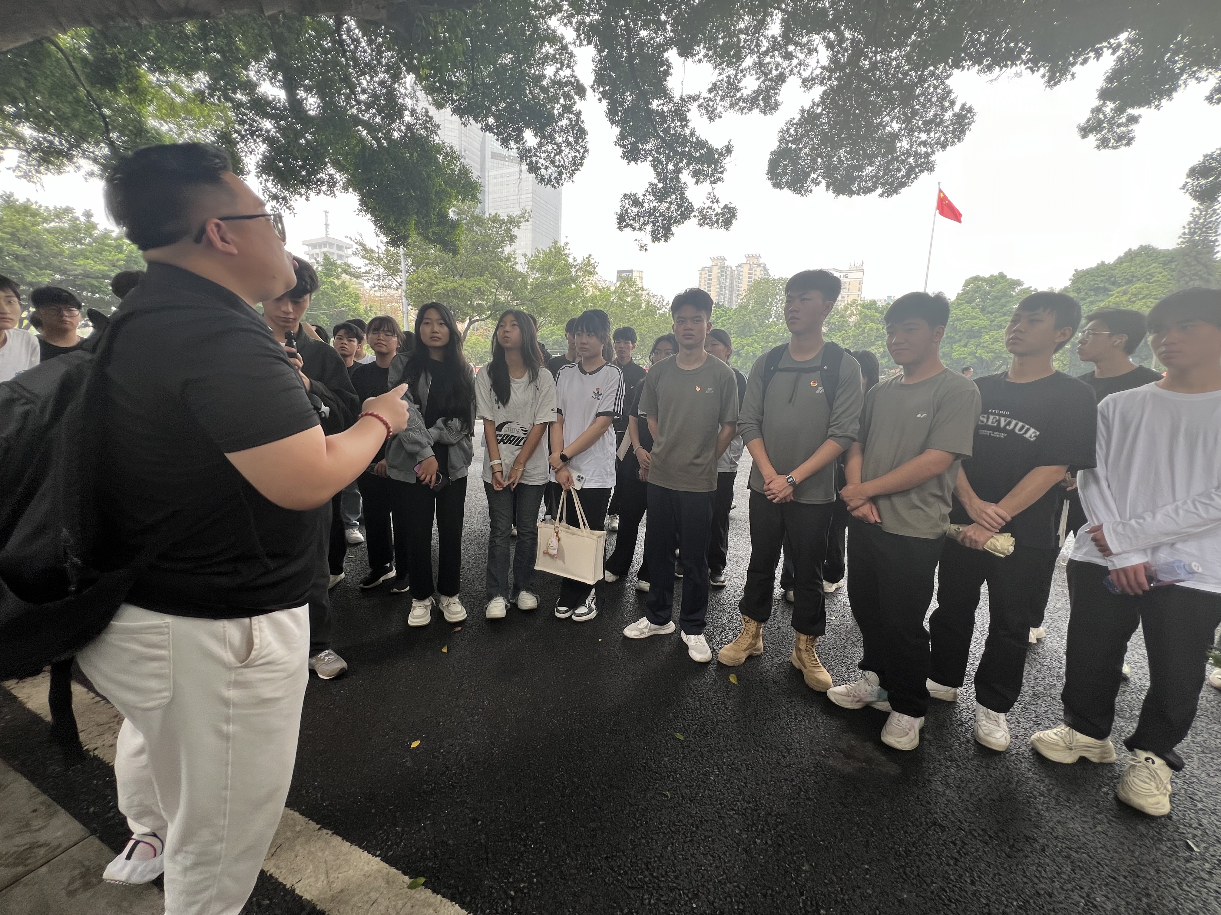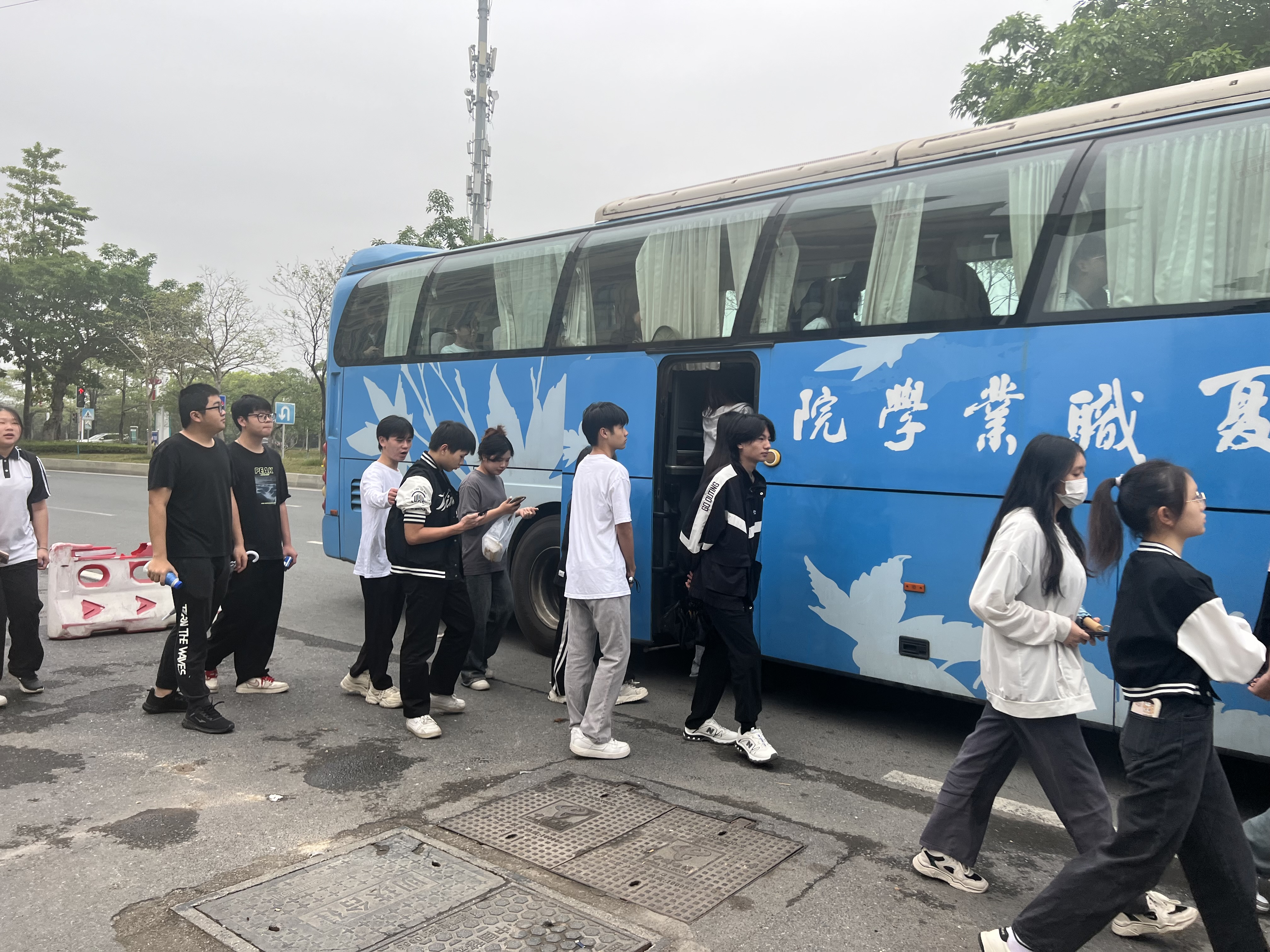 校团委刘达伟老师组织学生们上车,并做安全动员