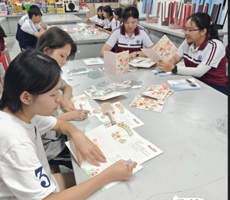 活动前期,幼儿教育教研室的黄金燕老师带领2025级幼儿教育班的学生,从卡纸裁剪、色彩搭配到手工花编织,手把手指导学生掌握贺卡制作技巧,并把对教师祝福、感恩的话语写在贺卡上,将技工学子的创新思维与手工匠心巧妙融合,让每一张贺卡都成为“有温度、有技术”的专属礼物。